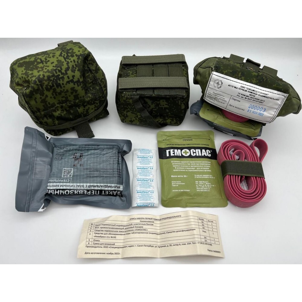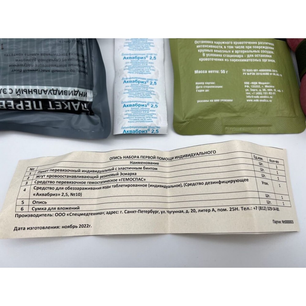 - Пакет перевязочный индивидуальный с эластичным бинтом: Пакет перевязочный содержит эластичный бинт, предназначенный для фиксации повязок и оказания поддержки при травмах.