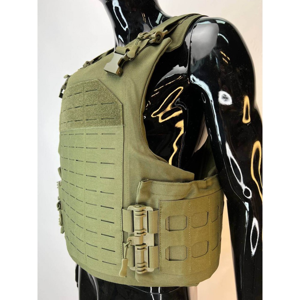 - Баллистический пакет: Бронекомплект оснащен баллистическим пакетом, включающим переднюю, заднюю и боковые пластины. Пакет выполнен из 40 слоев баллистической ткани из сверхвысокомолекулярного полиэтилена высокой плотности, а также имеет дополнительную плиту PE и слой пенки толщиной 4,5 мм. Уровень защиты данного пакета составляет 4.4 (плотность пуленепробиваемого слоя 145).